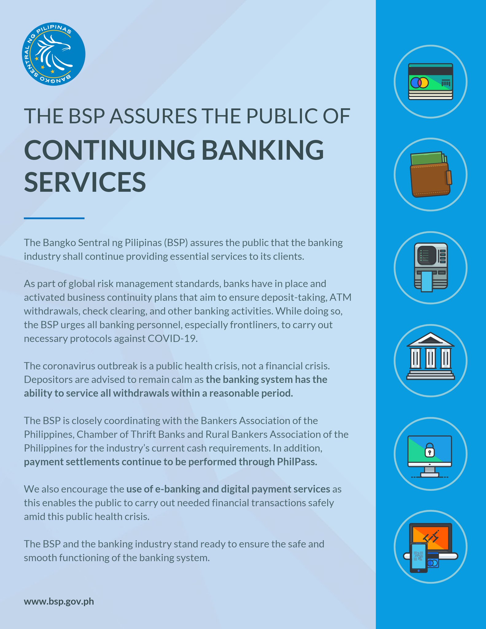 Bangko Sentral On Twitter The Bangko Sentral Ng Pilipinas Bsp Assures The Public That The Banking Industry Shall Continue Providing Essential Services To Its Clients Https T Co 6hkrijaukd