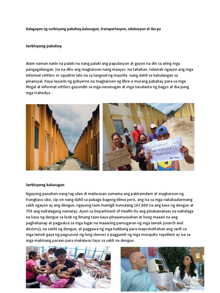 Aug 28 2016 Sana umayos ang kalagayan ng Pilipinas at maayos ang maraming sistema. Feb 18 2020 Kalagayan ng serbisyong Pabahay Pangkalusugan Transportasyon Edukasyon atbp Ang Pilipinas ay kasalukuyang humaharap ng sanda-makmak na mga isyu ukol sa mga suliraning panlipunan ilan sa mga ito ay ang antas ng pabahay panpangkalusugan transportasyon at edukasyon Pabahay Pabahay isa sa. Ngunit ang pribadong sektor ay mas malaki at malawak sapagkat ito serbisyong kabayaran.