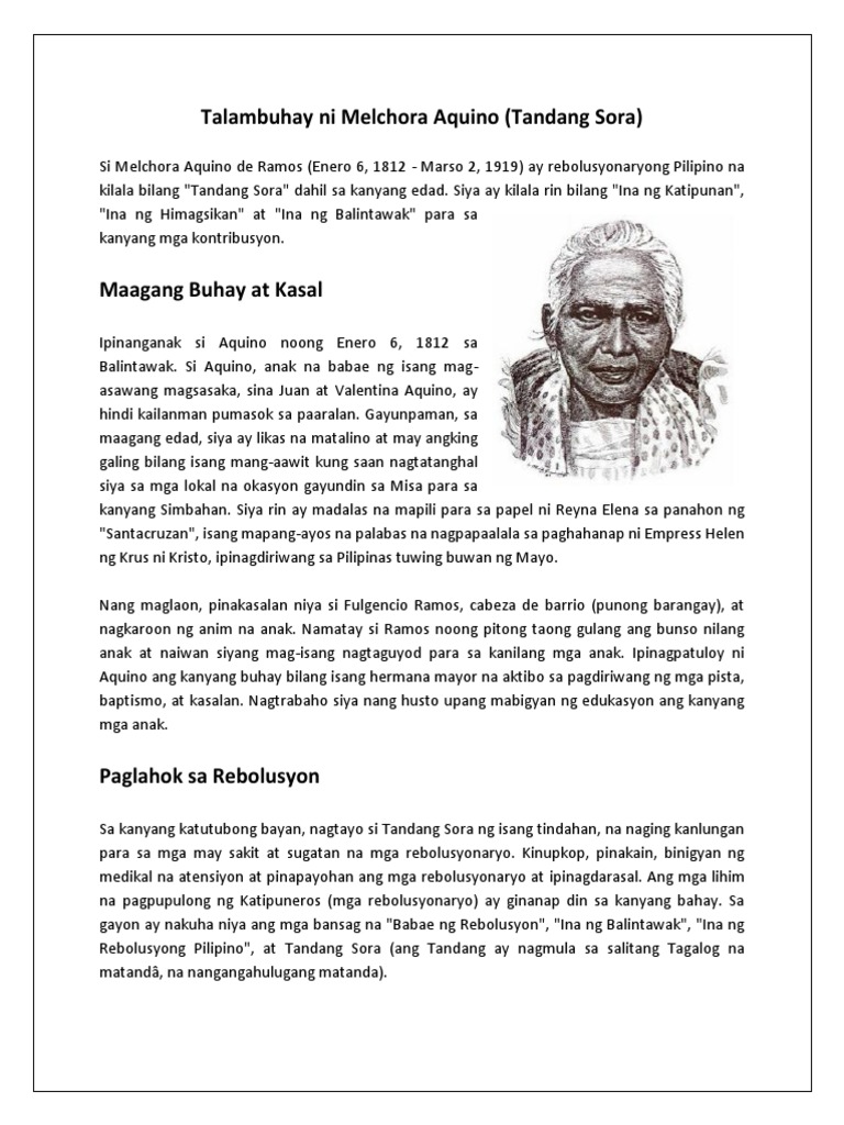 Pinamunuan niya ang pagtutol sa pananakop ng mga Amerikano hanggang siya ay mahuli noong 1901 ni US General Frederick Funston. Si Melchora Aquino kapanganakan 6 Enero 1812 kamatayan 2 Marso 1919 o Tandang Sora ay hindi nagkaroon ng pagkakataong mag-aral subalit kung pakikipagkapwa tao ang pag-uusapan ay nasa kanya na ang mga katangiang maaring ituro ng isang guro sa paaralan. 6 Enero 1812-2 Marso 1919 Binansagang Tandang Sora si Melchora Aquino Meltsra Akno bilang pagkilala sa kaniyang paglilingkod at pagkakanlong sa mga kababayan noong Himagsikang 1896 kahit na siy.