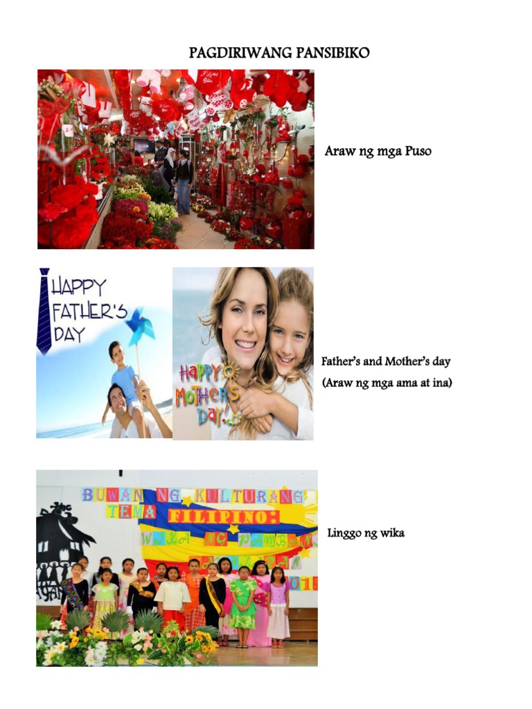 Nov 10 2012 MGA PANSIBIKONG PAGDIRIWANG Di tulad ng mgapambansang pagdiriwangna idinideklarang pistaopisyal ang mgapangsibikong pagdiriwangay karaniwang idinaraosnang may. Ginugunita natin sa mga araw na ito ang kabutihan ng ating ina at ama. Mga panrelihiyong pagdiriwang refer to religious celebrations in the Philippines.