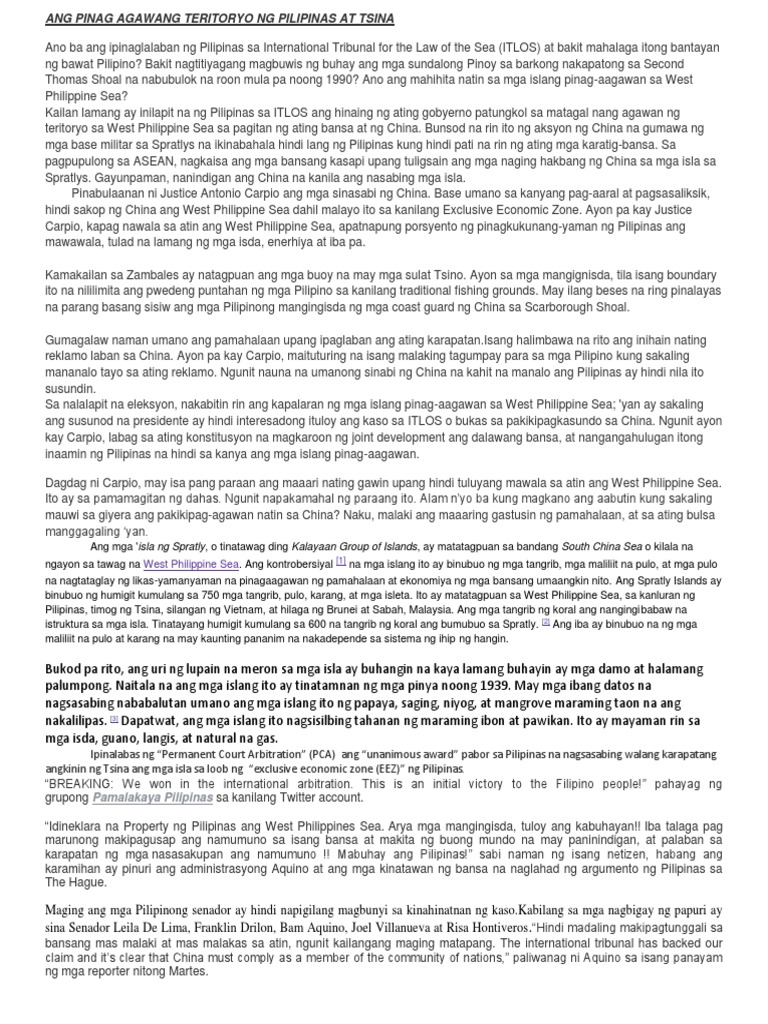 Maraming mga issue ngayon pagitan sa bansang Tsina at Bansang Pilipinas tungkol sa pag aagawan nang islang West Philippine Sea o tinatawag din itong South China Sea. Ang teritoryong kanilang inaangkin ay pinalilibutan ng naglalakihang barko ng Tsina at mga militar nito bilang bantay-dagat. 2015-08-16 Kailan lamang ay inilapit na ng Pilipinas sa ITLOS ang hinaing ng ating gobyerno patungkol sa matagal nang agawan ng teritoryo sa West Philippine Sea sa pagitan ng ating bansa at ng China.