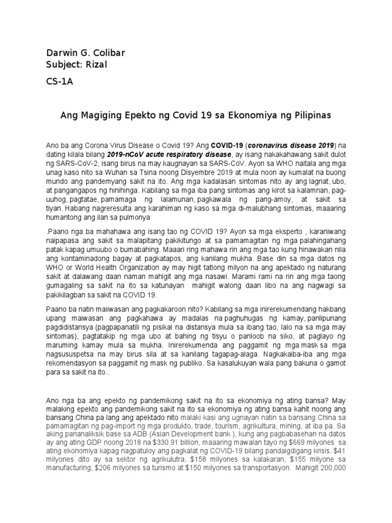 Epekto Ng Covid 19 Sa Ekonomiya Ng Pilipinas Docx